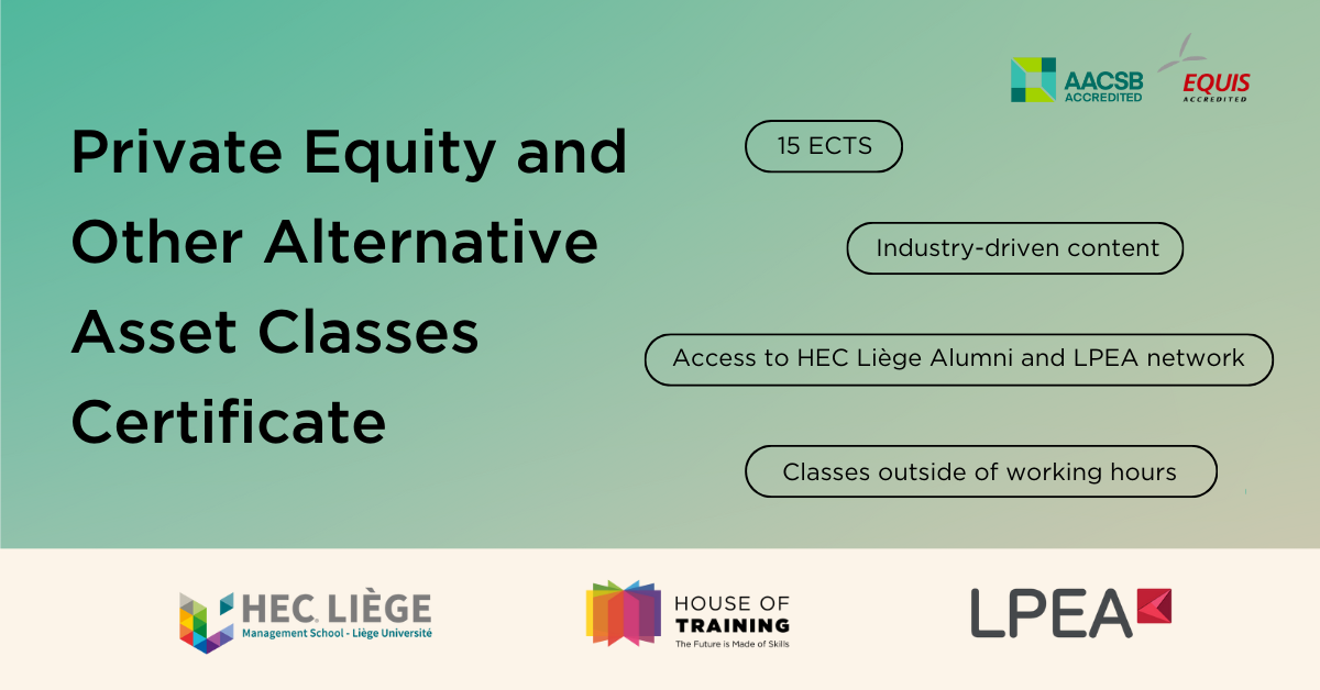 Delivered in partnership with HEC Liège, a double-accredited (EQUIS & AACSB) management school, House of Training and the Luxembourg Private Equity & Venture Capital Association (LPEA), the programme blends academic rigour with market expertise. It is designed for professionals in Luxembourg who want to advance their careers or strengthen their company’s talent in private equity and alternative investments. You will gain practical insights, strong networking opportunities, and the flexibility to tailor your learning journey through a selection of cutting-edge finance electives.